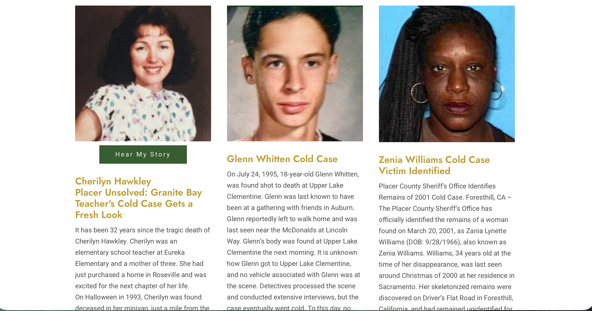 Here are three of the active cold cases currently featured on the website. I was responsible for formatting, and inserting the photographs, as well as organizing the written case summaries to ensure clarity and readability. Additionally, for the Hawkley case, I embedded a related video to provide visitors with deeper context and increase engagement with the story.