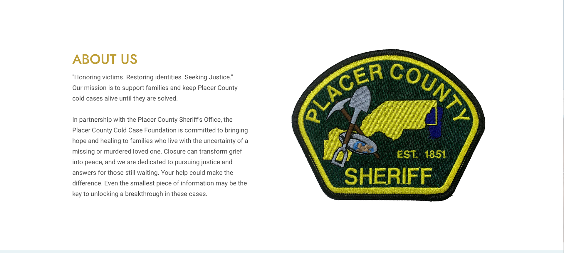 This section represents the middle portion of the page, where I developed content highlighting the Placer County Cold Case Foundation’s partnership with the Placer County Sheriff’s Office. The write-up clearly communicates the collaboration and reinforces credibility and trust with site visitors.